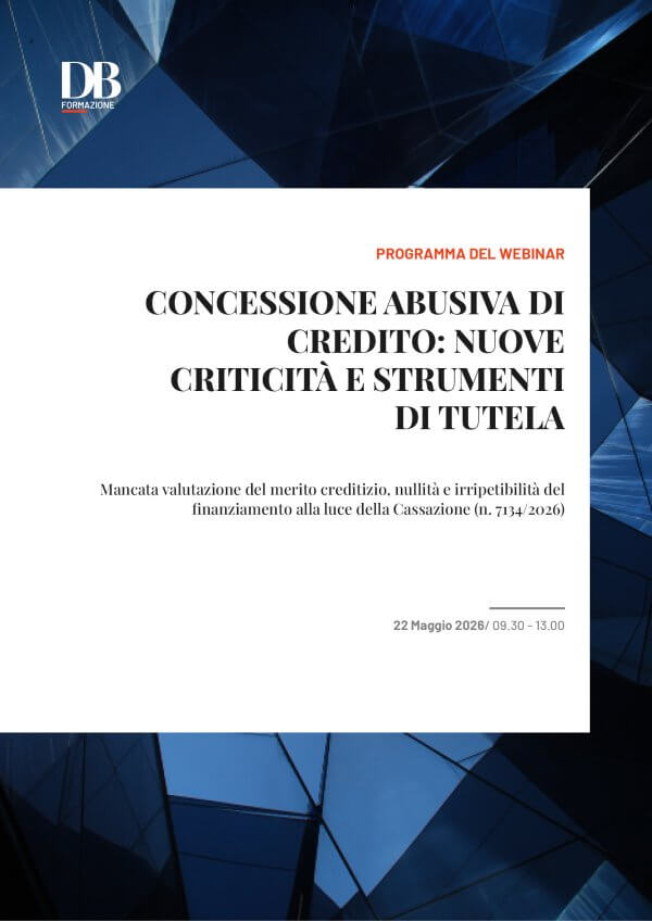 La nostra Rivista ha organizzato per il giorno 22 maggio 2026 un webinar sulle più recenti criticità in tema di concessione abusiva di credito, che approfondirà gli obblighi della banca in sede di valutazione e concessione del finanziamento, nonché i profili di salvaguardia e tutela, con particolare riferimento al contesto della crisi dell’impresa finanziata.