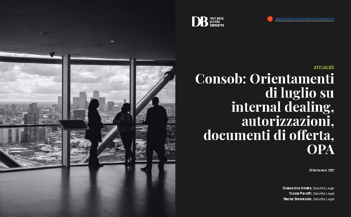 Nel dettaglio, la delibera n. 21950 concerne l’OPA volontaria totalitaria promossa dall’offerente ai sensi degli artt. 102 e 106, co. 4 del TUF, per il tramite di una società di nuova costituzione, sulle complessive azioni ordinarie emesse dalla target. Stante l’acquisizione indiretta delle partecipazioni di controllo in un intermediario finanziario di diritto italiano e in una società di diritto greco attiva nel settore dei crediti deteriorati in caso di esito positivo dell’offerta, è stato richiesto il rilascio, in conformità alla normativa di settore, delle apposite autorizzazioni da parte di Banca d’Italia e di Banca di Grecia, rispettivamente pervenute in data 1° giugno 2021 e 6 luglio 2021.