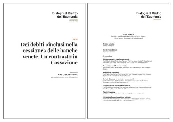 [5] Cass., n. 15083(2025: l’esame della clausola principia a metà di p. 15; essa viene riportata a p. 13, secondo questo testo: «per “Passività Incluse” si intendono i singoli debiti, passività, obbligazioni e impegni, di BPVI e VB […] che derivano da rapporti inerenti e funzionali all’esercizio dell’impresa bancaria, sono regolarmente evidenziati nella contabilità aziendale e sono individuati e precisamente indicati per categoria nel prospetto qui allegato sub Allegato D […], tra cui, in particolare: […] vii) i contenziosi civile (e relativi effetti negativi, anche per oneri e spese legali) relativi a giudizi già pendenti alla Data di Esecuzione, diversi da controversie con azionisti delle Banche in LCA e con obbligazionisti convertibili e/o subordinati che abbiano aderito, non abbiano aderito ovvero siano stati esclusi dalle offerte di transazione presentate dalle Banche in LCA e dai c.d. “Incentivi Welfare” (di seguito il Contenzioso Pregresso”) nonché i relativi fondi».
