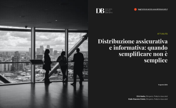 [1] Il provvedimento, decritto come ‘Provvedimento recante modifiche e integrazioni finalizzate alla semplificazione e razionalizzazione dell’informativa precontrattuale sul distributore di cui al Regolamento 40/2018 e dell’informativa precontrattuale sul prodotto di cui al Regolamento 41/2018, e relativi allegati, nonché in materia di finanza sostenibile’, è consultabile al seguente link: https://www.ivass.it/normativa/nazionale/secondaria-ivass/normativi-provv/2024/provv-147/index.html.