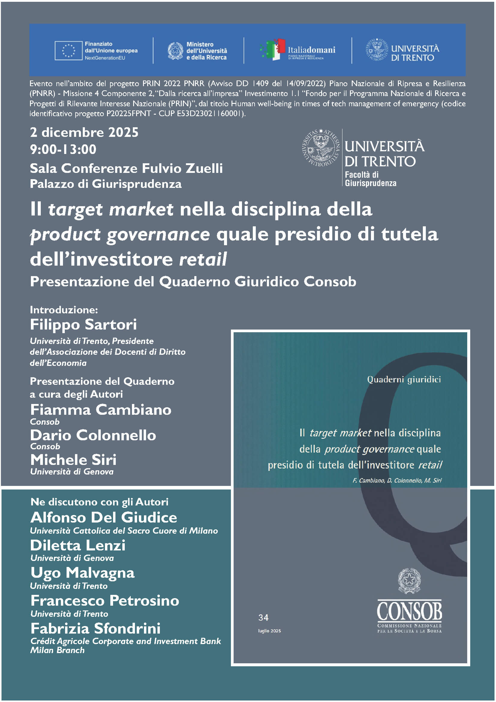 Nella mattinata di martedì 2 dicembre 2025, presso la Sala Conferenze Fulvio Zuelli del Palazzo di Giurisprudenza dell’Università di Trento, si svolgerà la presentazione del Quaderno Giuridico Consob “Il target market nella disciplina della product governance quale presidio di tutela dell’investitore retail”.