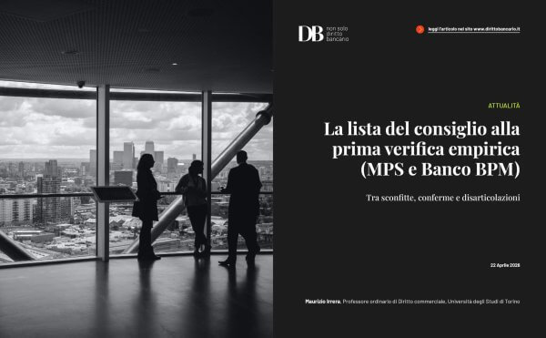 [1] Cfr. in argomento, se vuoi, i miei scritti: Lista del consiglio e governo dell’impresa: i casi Banco BPM e MPS, In Diritto Bancario.it, 1° aprile 2026; Banco BPM e MPS: lista del consiglio e ruolo dei proxy advisors, in Diritto Bancario.it, 13 aprile 2026.