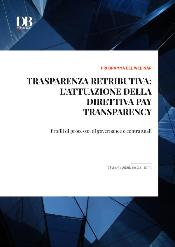 La nostra Rivista ha organizzato per il 23 Aprile 2026 un webinar che analizzerà l’attuazione della Direttiva Pay transparency in Italia, dal punto di vista dei necessari adeguamenti in chiave di trasparenza retributiva dei processi e delle policy aziendali sulla gestione del personale, della politica retributiva, nonché dei contratti individuali di lavoro.