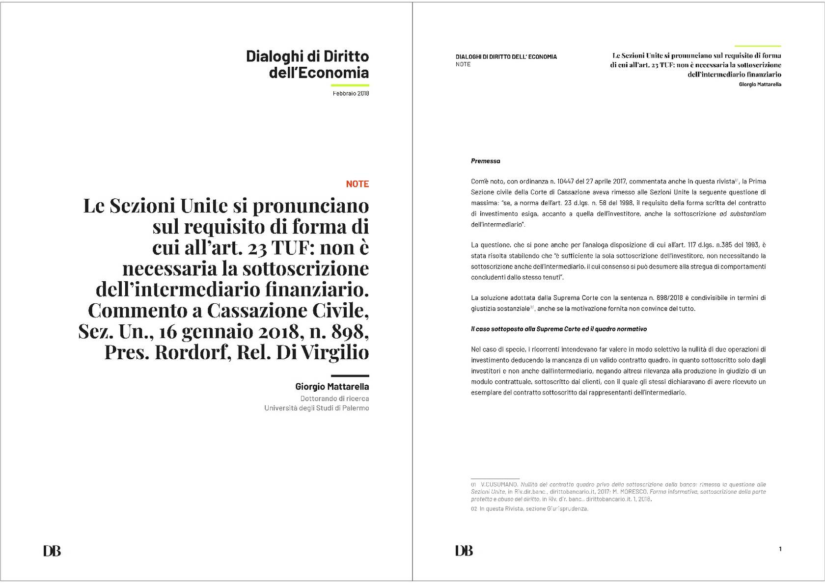 Com’è noto, con ordinanza n. 10447 del 27 aprile 2017, commentata anche in questa rivista [1], la Prima Sezione civile della Corte di Cassazione aveva rimesso alle Sezioni Unite la seguente questione di massima: “se, a norma dell’art. 23 d.lgs. n. 58 del 1998, il requisito della forma scritta del contratto di investimento esiga, accanto a quella dell’investitore, anche la sottoscrizione ad substantiam dell’intermediario”.